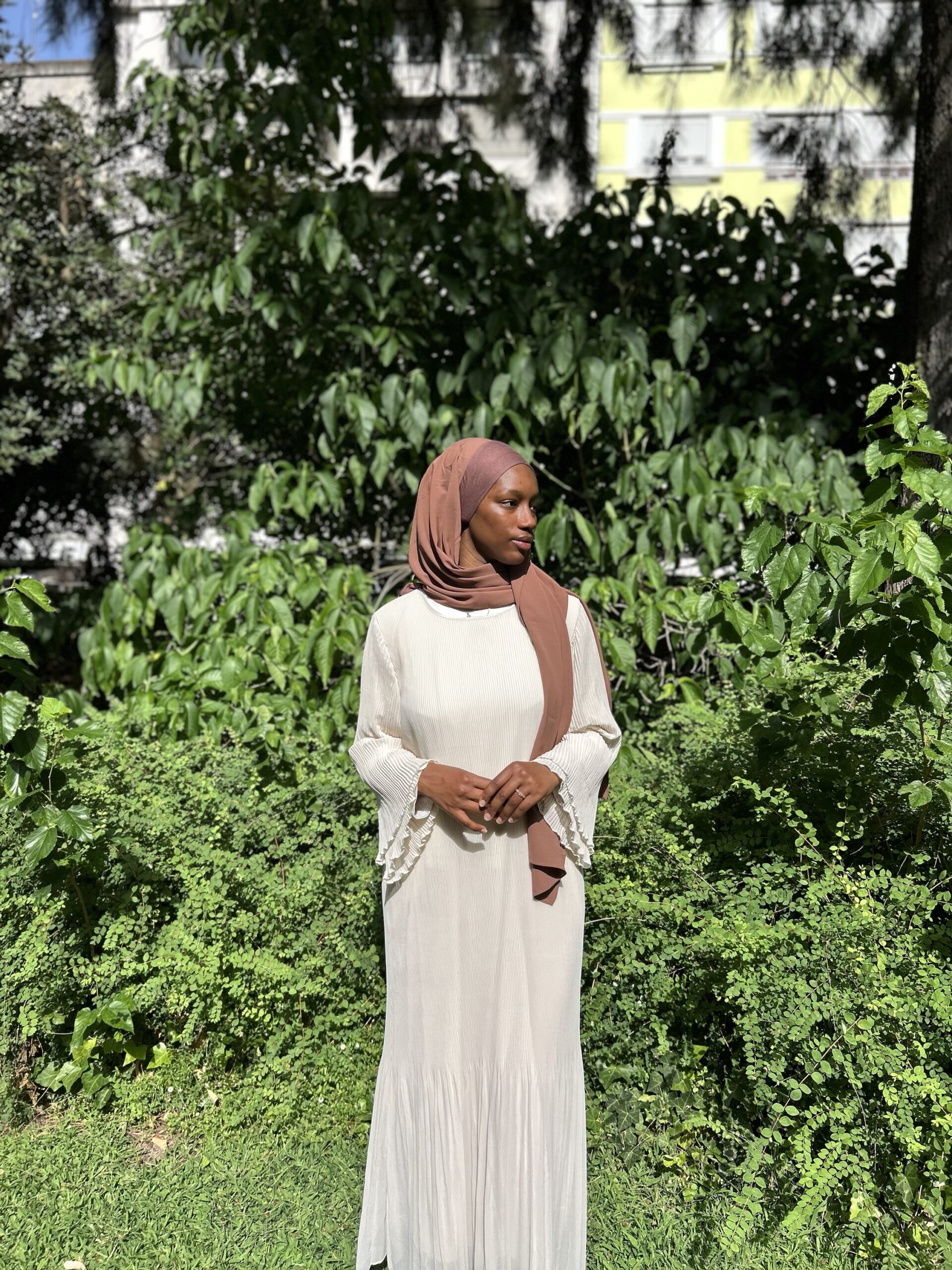 Em tom creme suave, este vestido plissado transmite delicadeza e sofisticação.